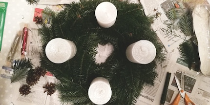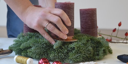 Auch bei mir folgen die Kerzen. Ich benutze aber keine Halter, sondern stecke sie mit einem robusten Drahtstück in den Kranz. Hierfür ein etwa zehn Zentimeter langes Stück zuschneiden und das eine Ende an einer Kerze erhitzen. Dieses wird mithilfe einer Zange in die Kerze gesteckt. Die andere Seite kommt in den Kranz. Ich platziere die erste Kerze meist auf dem Anfangs-/Endstück, da dieses nicht das optische Highlight des Kranzes markiert. Die Kerzen sitzen direkt auf den Tannzweigen, was kein Problem darstellt, solange du sie nicht bis ganz nach unten brennen lässt. Sonst wird es in deinem Stübchen wärmer, als du es dir vorgestellt hast.
