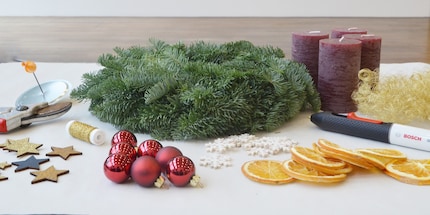Für die erste Variante haben wir uns einen fertigen Kranz kommen lassen. Also dekoriert muss er noch werden, aber die echten Zweige sind schon akkurat um den Ring gebunden. Karina und ich entscheiden uns, die Deko in rot-gold zu halten. Klassisch weihnachtlich halt. Dafür haben wir vier Kerzen, Sterne, Schneeflocken, Orangenscheiben, selbstgesammelte Hagebuttenäste, Engelshaar, kleine Weihnachtskugeln und einen goldenen Dekodraht organisiert. Ausserdem benötigen wir Heissleim, um alles nachhaltig auf den Kranz zu bringen.