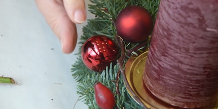 Erst müssen die Kerzen platziert werden. Dafür setzten wir spezielle Adventskranz-Kerzenhalter ein. So kannst du sicher sein, dass kein heisses Wachs auf den Kranz tropft. Stecke zuerst die Kerze mittig auf den Halter. Diesen platzierst du an der gewünschten Stelle, sodass er gut hält. Sind alle Kerzen schön gleichmässig verteilt, kannst du mit der Deko beginnen.