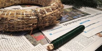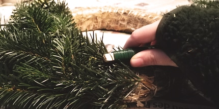 Um den Kranz zu winden, brauchst du einen Kranz-Rohling (meiner ist aus Stroh), Tannenzweige und grünen Draht, der fällt weniger auf. Meine Zweige kommen von der Nordmanntanne, da sie schön buschig sind und erst spät nadeln. Ich muss mir erst 10 – 15 Zentimeter lange Zweige aus grösseren Bündeln zurechtschneiden. Ich achte darauf, eine gute Mischung aus einfachen und mehrgliedrigen Zweigen hinzubekommen, damit am Ende ein gleichmässiger Kranz entsteht. Nun wird der Draht für einen soliden Anfang ein paarmal um den Strohkranz gewickelt.