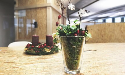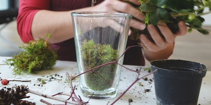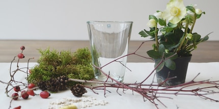 Wer nicht auf Kränze steht, aber trotzdem ein bisschen Weihnachten ins Haus bringen will, kann sich eine Deko im Glas basteln. Dazu brauchst du ein vasenartiges Glas, eine Christrose (Helleborus) oder eine Pflanze nach Wahl, etwas Moos, Hagebuttezweige und gewünschte Deko.