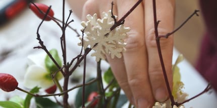 Fülle etwas Moos unten ins Glas. Danach holst du die Christrose aus dem Plastiktöpfchen und umwickelst sie mit Moos. Jetzt kommt die Pflanze ins Glas und wird etwas hineingedrückt. Schon kann mit der Verzierung begonnen werden. Erlaubt ist, was gefällt. Wir stecken ein paar rote Hartriegelzweige rein und kleben Schneeflöckchen dran. Und zwar von beiden Seiten des Zweiges, damit die Weihnachtsdeko aus jedem Winkel des Raumes etwas hermacht. Uns reicht das schon, aber du kannst natürlich noch mehr hin kleben, hineinstecken und umwickeln. Wir haben für unsere Sparflamme-Version nur knapp 20 Minuten benötigt.