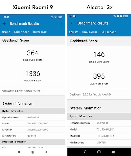 Im Alcatel 3x steckt der Helio P22 und die PowerVR-GPU sowie sechs Gigabyte Arbeitsspeicher. Das Redmi 9 kann nur vier Gigabyte bieten. Aber beim Benutzen der beiden Smartphones fühlt sich das Redmi 9 fixer an. Die Ladezeiten erscheinen kürzer und die Benutzeroberfläche wirkt flüssiger. Meine subjektiven ersten Eindrücke will ich noch überprüfen. Ich schicke die beiden Günstig-Smartphones deshalb auf die Geekbench 5. Die App lässt die Smartphones verschiedene Aufgaben mit einem oder mehreren Rechenkernen erledigen und vergibt Punktzahlen, nachdem wie gut sich die Hardware dabei schlägt. Nachdem die Smartphones an die Schmerzgrenze gehen mussten, steht ein Sieger fest: Das Redmi 9 364 und 1336 Punkte im Single- und Multi-Kern-Modus. Das Alcatel 3x schafft nur 146 und 895 Punkte.