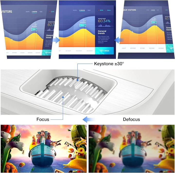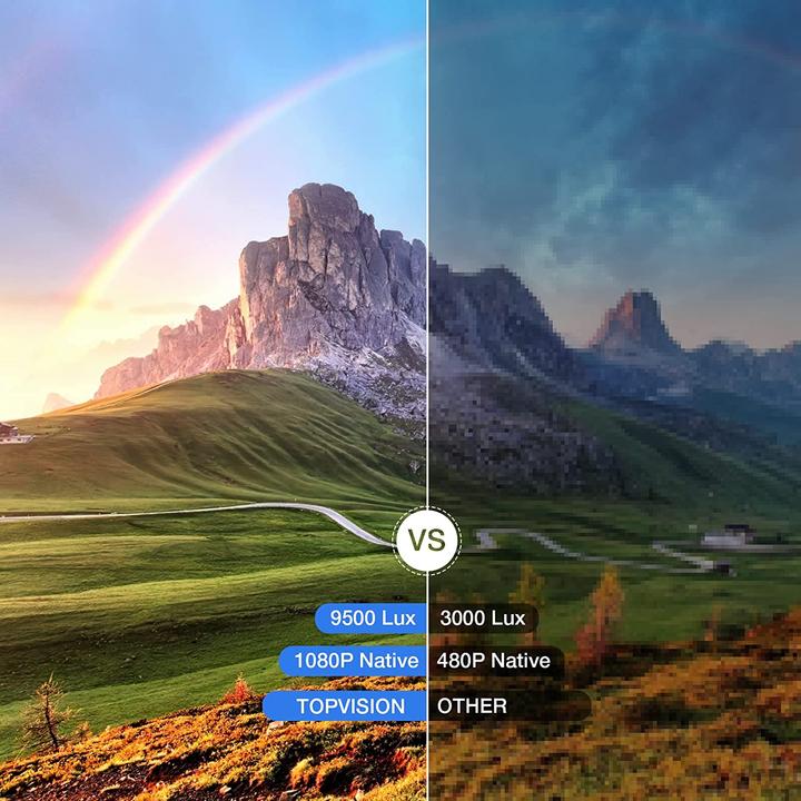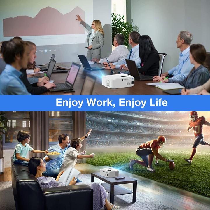 Dieser 1080P Full HD Videoprojektor in Weiss kann Bilder mit einer Grösse von bis zu 350 Zoll (8,89 m) projizieren. Die eingebauten Dual-Stereo-Lautsprecher mit Sound Retrieval System sorgen für ein klares Klangerlebnis mit kraftvollen Bässen. Die Lebensdauer der Glühlampe wird durch das hocheffiziente und leise Kühlsystem auf 150.000 Stunden verlängert, was etwa 20 Jahren entspricht. Diese Lampe hat eine Helligkeit von 9.500 Lumen. Mit einer Bildschirmauflösung von 1920 × 1080 Pixeln und einem Kontrastverhältnis von 12.000:1 werden sogar 4K-Videos unterstützt. Die Schnittstellen umfassen Ausgänge für HDMI, USB, AV und einen 3,5 mm Audioausgang. Der Beamer ist kompatibel mit Handys, Tablets, PCs, Spielkonsolen und TV-Boxen und ist damit nicht nur für das Heimkino, sondern auch für ein Bürosetting geeignet. Im Lieferumfang enthalten sind neben dem Beamer eine Tragetasche, ein HDMI-Kabel, ein 3in1 Audiokabel und eine Fernbedienung.