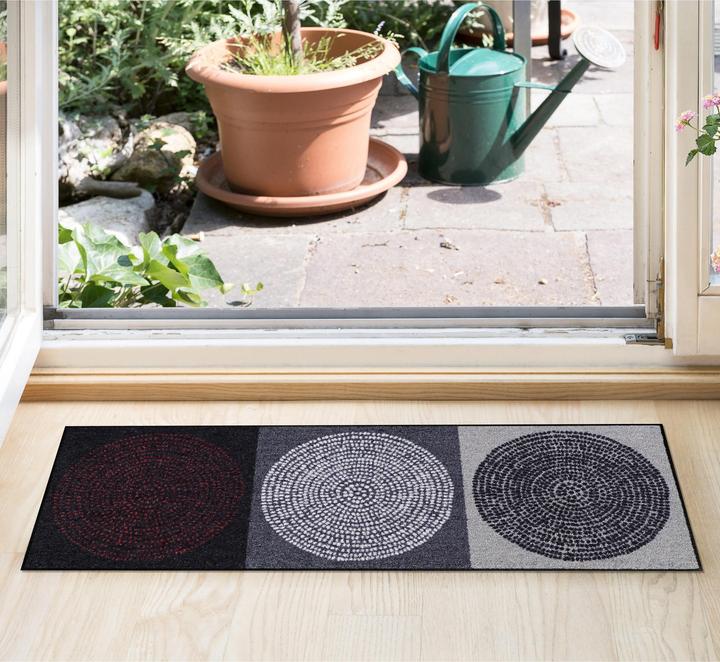 Salonloewe Fussmatte "Nestor". Das moderne Motiv verzaubert, egal ob Sie die Fussmatte als funktionale Schmutzfangmatte oder als attraktiven Innenraumteppich verwenden. Schmutz wird zuverlässig aufgefangen, was sie ideal für den Innenbereich und geschützte Aussenbereiche macht. Die Matte ist robust, langlebig und leicht zu reinigen. Sie ist für Fussbodenheizungen geeignet und hat eine rutschfeste Gummirückseite.