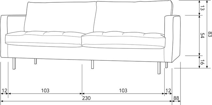 Die Rodeo-Sitzserie der niederländischen Marke BePureHome ist modern, robust und zeitgemäss. Diese klassische 2,5-Sitzer-Variante hat genähte Sitzkissen, die dem Sofa einen klassischen Touch verleihen. Das Sofa ist grosszügig, bietet viel Platz und hat einen weichen Samtstoff. Der schlanke Rahmen und die losen Kissen lassen das Sofa im Wohnzimmer dezent wirken. Die losen Kissen sind nicht umkehrbar. Die 16 cm hohen Beine sind aus Metall und schwarz lackiert. Die Sitzhöhe beträgt 47 cm, die Sitztiefe 58 cm, die Sitzbreite 206 cm, die Rückenlehne 49 cm hoch. Die Breite der Armlehnen beträgt 12 cm und die Höhe der Armlehnen 70 cm. Der Rahmen des Sofas besteht aus Massivholz, Spanplatte, Hartfaserplatte und Pappe. Die Bank ist im Zickzack aufgehängt. Der Sitz hat eine Schaumstofffüllung T3037, einen Standardschaumstoff mit hoher Haltbarkeit und hohem Sitzkomfort. Die Rückseite hat eine Füllung aus 70% geschnittenem Schaumstoff und 30% Silikon. Der samtige Stoff in Samt-Optik fühlt sich weich an, ist von schwerer Qualität und für den intensiven Gebrauch geeignet. Das Gewebe wurde nicht auf zusätzliche Behandlungen getestet, weshalb wir eine Imprägnierung des Sofas nicht empfehlen. Wenn dies als notwendig erachtet wird, geschieht dies auf eigene Gefahr und wir empfehlen Ihnen, es ausser Sichtweite zu testen. Die Rodeo Classic Serie besteht aus diesem 2,5-sitzigen Sofa, einem 3-sitzigen Sofa und einem Sessel/Liebesstuhl.