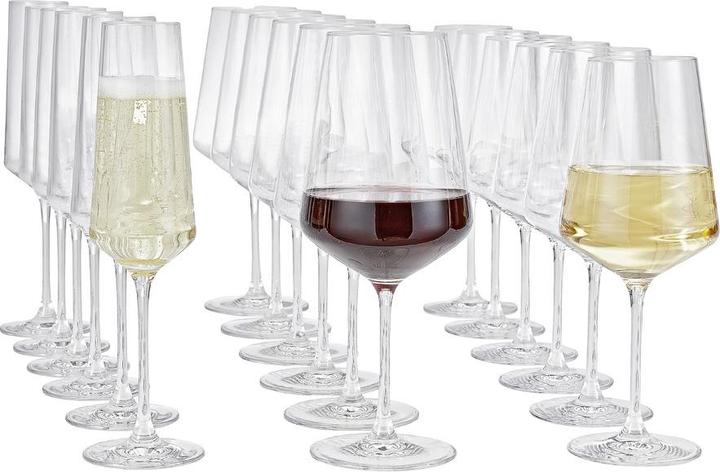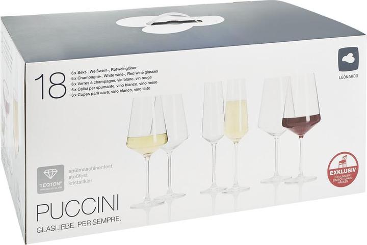 Die moderne Linienführung der Kelche trifft nicht nur den aktuellen Zeitgeist, sondern sorgt durch den breiten Kelchboden für eine optimale Entfaltung des Weinbouquets. Modernes Design für den perfekten Weingenuss - nicht nur für Gourmets. In Zusammenarbeit mit führenden Sommeliers und Sterneköchen entwickelt und mit zahlreichen Designpreisen ausgezeichnet. Das Leonardo Puccini 18er Set besteht aus 6 Rotweingläsern, 6 Weissweingläsern und 6 Sektgläsern. Volumen: 280 ml / 560 ml / 750 ml.