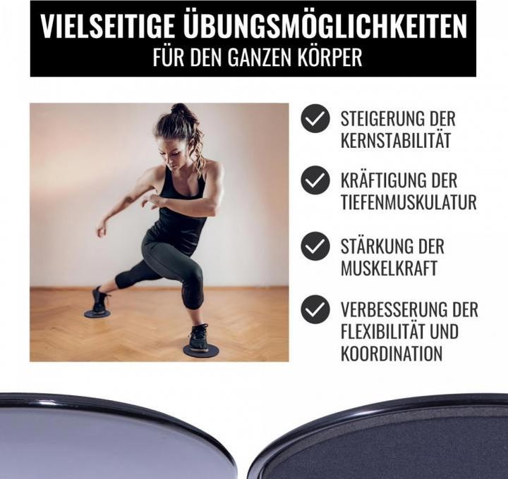 Mit diesen Pads hast du die Möglichkeit, Gleitübungen komfortabler zu gestalten. Zum Beispiel kannst du einen gleitenden Ausfallschritt durchführen, bei dem du deinen Fuss nicht vom Boden abhebst, sondern kontrolliert über dem Boden nach hinten oder vorne fahren lässt. Durch die langsamen Bewegungen wird auch deine Tiefenmuskulatur angesprochen. Natürlich kannst du die Slide Pads auch nutzen, um deinen Oberkörper zu trainieren. Hier bieten sich Plank- und Liegestützvarianten an. Damit du die Pads sicher und sauber transportieren kannst, kommen sie in einer praktischen Tragetasche.