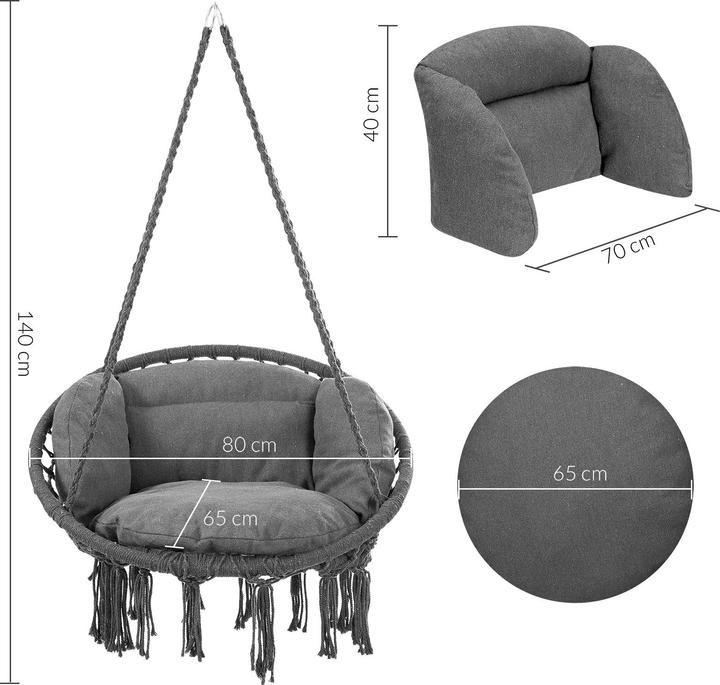 Entfliehen Sie dem Alltag und relaxen Sie. Der runde Hängesessel von Detex bietet mit zwei Kissen hohen Sitzkomfort. Der Sessel mit 60 cm Sitzfläche ist ein stylischer Hingucker und bequem obendrein. Die hohe Rückenlehne und die dicke Füllung der Kissen passen sich der Körperform an, sind ergonomisch und angenehm für Ihren Rücken. Der Hängesessel besitzt einen robusten, verzinkten Rahmen und kann problemlos mit bis zu 150 kg belastet werden. Dank der zwei massiven Metallringe lässt sich der Hängestuhl individuell ausrichten und kann in alle Richtungen geschaukelt werden. Die zwei verzinkten Eisenringe erlauben ein getrenntes oder gebündeltes Aufhängen. Der Korb des Hängesessels ist mit einem Geflecht aus Baumwolle und Polyester überzogen, welches eine langlebige Nutzungsdauer verspricht. Zudem ist es witterungsbeständig und leicht zu reinigen. UV-Licht, Schmutz und Wasser können dem Hängesessel nichts anhaben. Mit der stilvollen Farbe, der raffinierten Makramee-Knüpftechnik und dem zeitlosen Boho-Design kann das Allroundtalent sowohl im Haus als auch draussen zum Relaxen eingesetzt werden und stellt eine tolle Ergänzung für bereits vorhandene Gartenmöbel dar. Schalten Sie vom Alltag ab und geniessen Sie die Zeit.