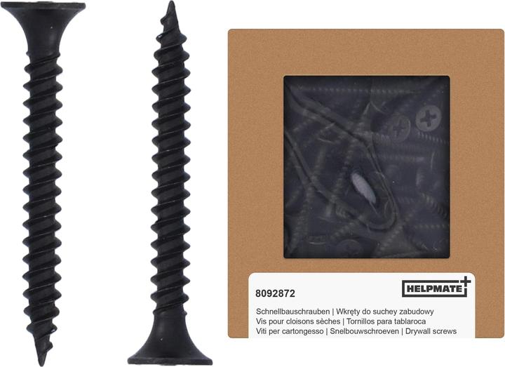 Entdecke Helpmate Schnellbauschrauben. Die schwarze Phosphatierung bietet effektiven Korrosionsschutz bei kurzzeitiger Feuchtebeanspruchung, ideal für den Bau oder Transport und perfekt für die Anhaftung von Spachtelmasse. Mit einem feinen selbstschneidenden Gewinde ermöglichen diese Schrauben ein müheloses Einschrauben in Metall ohne hohen Kraftaufwand. Der Trompetenkopf sorgt für ein bündiges, glattes Versenken der Schraube und schont dabei die Oberfläche der Gipsplatte. Dank der scharfkantigen Spitze ist kein zeitaufwendiges Vorbohren erforderlich, was die Anwendung besonders effizient macht. Ideal für die Fixierung von Gipskartonplatten auf Unterkonstruktionen aus Metall. Für die Befestigung auf Untergründen aus Holz eignen sich die Schnellbauschrauben mit Grobgewinde. Verlasse dich auf Helpmate für erstklassige Schnellbauschrauben und erleichtere dir deine Bauprojekte. Lieferumfang: 250 Schnellbauschrauben 3,9x35.
