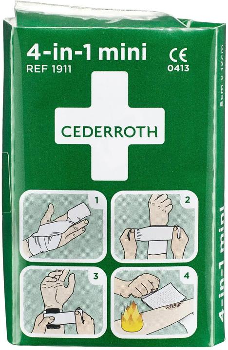 Der Cederroth 4-in-1 Verband ist für Erste-Hilfe-Situationen gedacht. Der Verband hat vier Funktionen und ersetzt dadurch eine Reihe herkömmlicher Erste-Hilfe-Verbände und -Kompressen:
