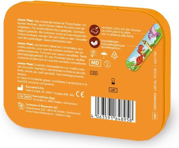 Wenn kleine Abenteurer spielerisch die Welt erkunden und aktiv über Sport- und Spielplätze tollen, bleibt der ein oder andere Kratzer nicht aus. Dicke Krokodilstränen trocknen Sie am schnellsten mit einer liebevollen Umarmung und Junior Plast. Die hypoallergenen Kinderpflaster im praktischen Blechböxli lenken mit ihren aufmunternden Motiven schnell vom Schmerz ab und schützen oberflächliche Wunden zuverlässig. Das Set enthält 20 Pflaster, so sind Sie mit ihrer Haus- oder Reiseapotheke lange ausgestattet.