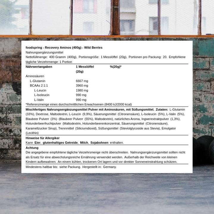 Zutaten | L-Glutamin(33%) | Dextrose | Maltodextrin | L-Leucin(9 |9%) | Säuerungsmittel( Citronensäure) | L-Isoleucin(5%) | L-Valin(5%) | Blaubeer Pulverr( Blaubeer Pulverr(55%) | Maltodextrin)(3%) | natürliches Aroma | Ingwerextraktpulver(1 |3%) | Holunderbeerfruchtpulver( Maltodextrin | Holunderbeerenkonzentrat | Säuerungsmittel( Citronensäure) | Karamellzucker Sirup) | Trennmittel( Siliciumdioxid) | Süssungsmittel( Steviolglycoside aus Stevia) | Emulgator( Lecithin). |