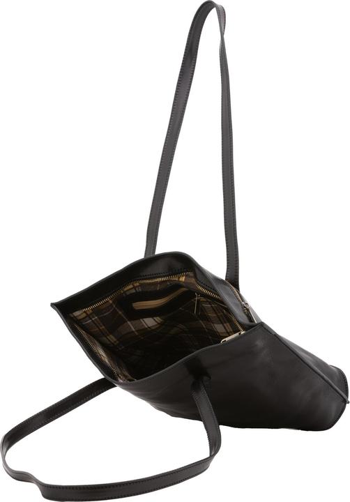 Damen-Umhängetasche mit Reissverschluss. Sie verfügt über eine Innentasche mit Reissverschluss und zwei offene Innentaschen sowie eine Rückseite mit Reissverschluss-Aussentaschen. Der Schultergurt fehlt. Der Griff ist aus Leder. Es gibt ein Innenfach und das Aussenmaterial ist aus Leder. Das Innenfutter besteht aus Baumwolle. Masse: 27 x 38,5 x 10 cm. Hergestellt in Italien.