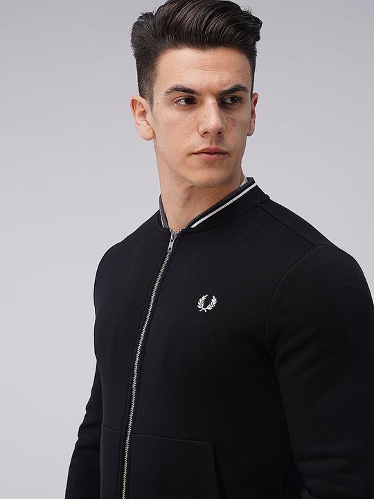 Die Fred Perry Jacke ist im beliebten College-Stil gehalten. Sie hat lange Ärmel, gestrickte, besonders breite Bündchen und einen dreifarbigen Kragen. Geschlossen wird die lässige Jacke mit einem durchgehenden Reissverschluss. Um den Look der Freizeit- und Sportjacke zu komplettieren, hat sie zwei Eingrifftaschen.
