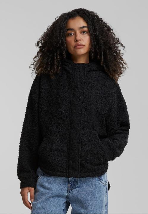 Mit flauschigem Sherpa-Material, einer Kapuze sowie einer Känguru-Tasche präsentiert sich diese Damenjacke überaus gemütlich und durch das glänzende Futter schick zugleich. Feine Details sind die weiten Ärmel mit Bündchen sowie der runde und auf der Rückseite längere Saum. Geschlossen wird die Jacke mit einem Reissverschluss mit Blende, die sich mit zwei Druckknöpfen verschliessen lässt. Die kuschelige Begleiterin besteht aus Polyester und hat eine Loose Fit Passform.