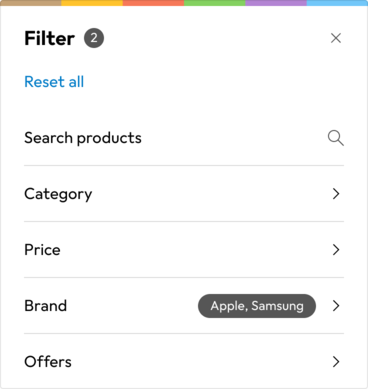 Any active filters are displayed in a static chip inside the mobile filters dialog. Note that the number “2” displayed next to “Filter” is a Badge.