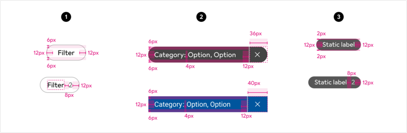 A chip allows users to filter content (interactive) or view an element’s status (static).