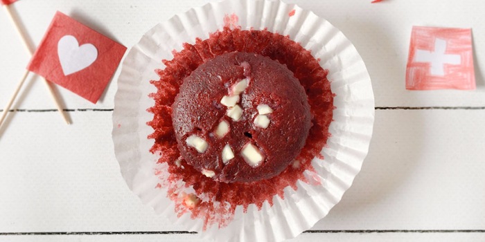 Desserts for the upcoming national day celebrations should of course be in our national colours. How about moist little chocolate cakes in red with white chocolate chips? Red and white, just like the Swiss flag.