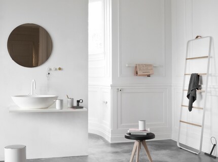 Images: Muuto, MenuBring the cosiness of your living room to the bathroom: Compared to your conventional chrome accessories, wood creates warmth in the bathroom. A wooden stool combines visual and practical aspects. A wooden ladder is a great way to hang up hand towels. If you invest in colour-coordinated towels, there’s no need to hide them behind cabinet doors. Rolled up and placed on an open shelf or arranged in baskets, they look pretty and fill the bathroom with life.