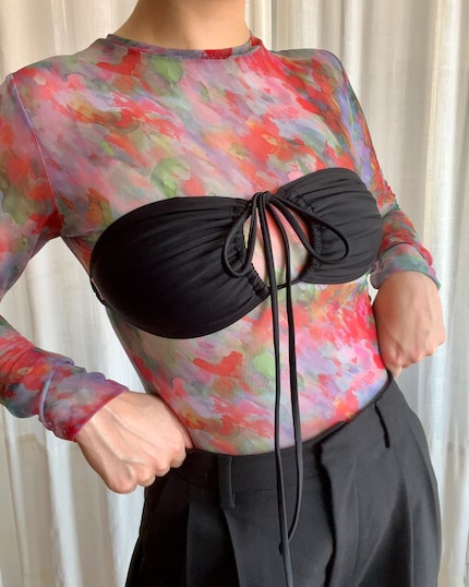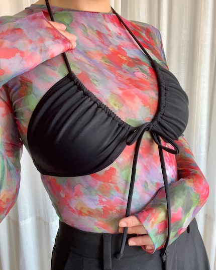 This is my other fave! The ruffled front and bow look particularly cute – and create a beautiful décolleté. Here’s how to achieve this look: pull the triangles wide apart on the string. Put the empty string this creates around your neck so that the bottoms of the triangles are facing each other vertically at the front. Then take the end of the neck string, pull them under your armpits and tie them at the back. Tie the open string at the front into a bow – et voilà.