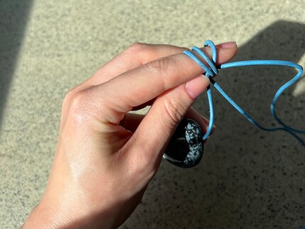 Step 2: Wrap the bottom end around your finger twice. Thread the end through these two loops and tighten the knot.