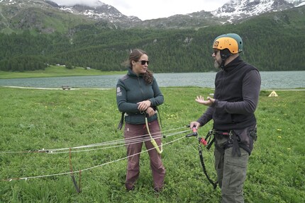 I met Andrea in Silvaplana in mid-June, with the summer heatwaves still a long way off and the lake cold. I soon realise that kitesurfing is a) an overload of equipment and b) a complex sport, which isn't going to make my job any easier, because after all, I'm not the most skilful person. To top it all off, this sport requires a fair amount of fearlessness from the beginner in me.