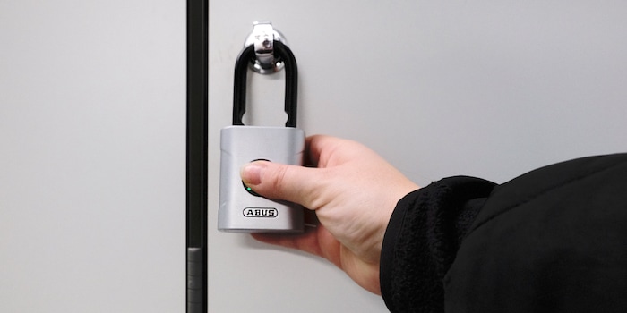 In the gym changing room, I’m initially unsure if the U-bolt of the lock will even fit through the locker opening. Fortunately, it can be threaded through to millimetre accuracy. After working out for an hour, I want to retrieve my valuables. At the first attempt, the black circle on the touch surface turns red – fingerprint not recognised. I assume it’s because of my sweaty hands. After giving them a good dry, the lock then springs open.