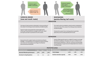 Show allThe number of questions surrounding face masks is almost as large as the demand for them. Which masks provide protection from the virus? Which ones protects people around you? And what’s the deal with the different levels of protection? There’s lots of information available online but it’s not always up-to-date nor necessarily helpful. Basically, there are three types of masks: surgical masks, respirators and homemade masks. In technical jargon, respirators are also called «particle-filtering half masks», surgical masks are sometimes referred to as «nose and mouth masks» and homemade masks as «community masks». The following illustration shows the most important features of surgical masks and respirators. Click here for a more in-depth look at the subject.