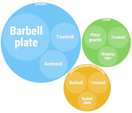 What kind of equipment is particularly popular in Swiss households? This January, virtual shopping carts were overall most frequently filled with yoga mats and fitness bands. Demand for more heavy-duty equipment has grown the most. In German-speaking Switzerland, barbells are in particularly high demand, while in the Romandy, barbell plates are the big sellers.