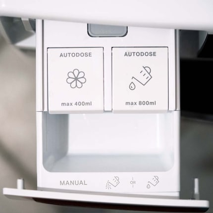 By far the best feature of the machine is the auto-dosing. Instead of the normal dosing compartment, a tank similar to that of a car awaits you. It holds 400 milliliters of fabric softener and 800 milliliters of detergent. The machine measures for you during washing how much detergent it needs. When the tank runs out, the B8 grumbles.