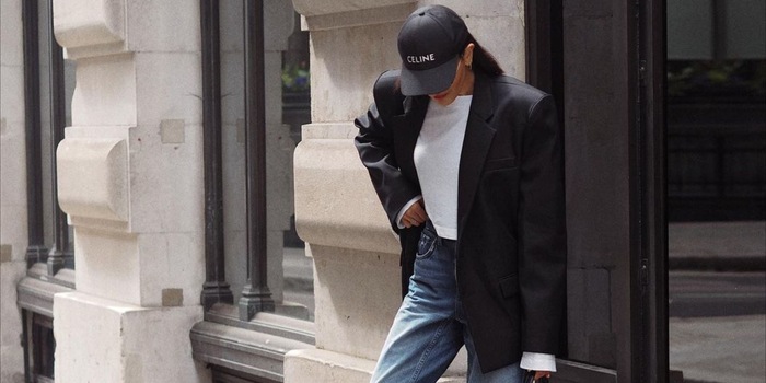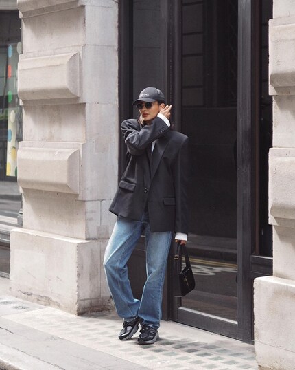 Show allWe’ve all had those days – days when your full wardrobe just refuses to provide you with smart looks. When you seem to have an acute shortage of outfits, it’s helpful to have a versatile, basic combo you can always fall back on. Influencer Selin Tufanoglu calls outfits like these her «everyday uniform». Hers consists of a dark oversized blazer, blue wide-leg jeans and a white long-sleeve shirt. Pairing the outfit with dad sneakers, a cap and sunglasses emphasises its chilled vibe. It’s all rounded off with a small leather handbag with gold details, subtly making the overall look more chic.