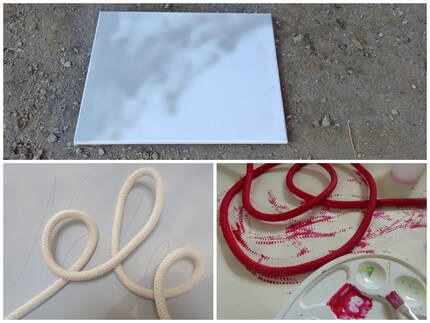 First, apply a base coat of spray paint to the canvas. I chose the colour grey. Then write your little one's name in pencil on the canvas before laying the cotton string over the letters. This will show you the length of string you need. Then paint the rope cut to the correct length in the colour of your choice and leave to dry.