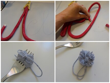 Once all the letters of the first name have been "corded", you can decorate the design with a small pom-pom made in two minutes using a large fork. It couldn't be easier: wrap the wool around the fork, then slip the thread between the prongs and tie a knot. Remove the small ball and cut all the loops with scissors.