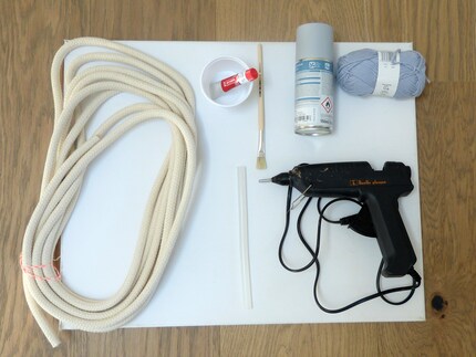 For the design, you'll need a stretcher with canvas (any size you like), cotton string (length varies depending on the first name), spray and acrylic paint, a hot glue gun and wool for the pom-pom. In addition, you may need a pencil, clothes pegs and a fork.