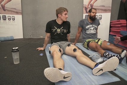 A few minutes of rest before they compete againNext: Things move on. The young woman has to compete in the official WOD for the Crossfit Open.