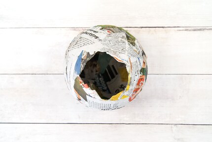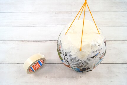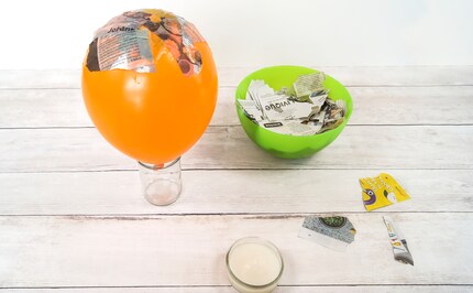 Step 2: Tear the newspaper into small pieces and mix the paste according to the manufacturer's instructions. Pull each piece of newspaper through the paste and place it on the balloon. Cover the balloon with about three layers except for the bottom part. Then leave the paste to rest for at least 24 hours until it is completely dry. If the balloon does not stay in the jar, you can fix it with the adhesive tape.