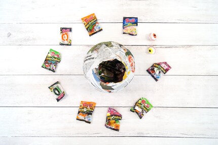 Step 4: Now fill the belly of the piñata with a colourful selection of sweets. Be careful not to fill the piñata too heavily. Otherwise you will have trouble hanging it up later.