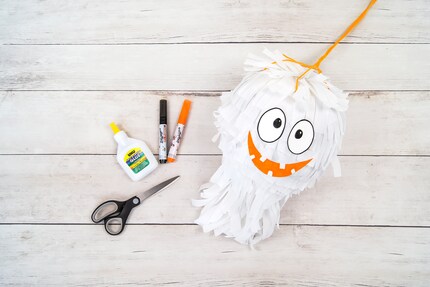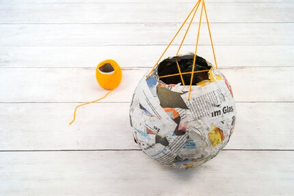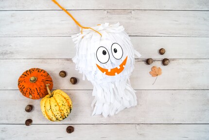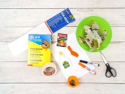 Show allTo make the piñata with papier-mâché, you will need a balloon, newspaper and fish paste. You can achieve the spooky shape using crepe paper, clay paper and pencils. As an aid, use scissors, glue, a needle and a string. A glass and a bowl are also handy. And of course the candy should not be missing.