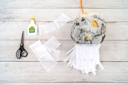 Step 7: Now cut fringes into the crepe paper strips for decoration. Start with slightly thicker strips about 10 cm wide at the bottom and get smaller and smaller towards the top until you have strips about 5 cm thick from the centre. Apply some glue to the joint of the fine crepe paper and carefully stick it around the piñata. Glue the next layer directly over the previous one. This will also hide the newspaper between the fringes.