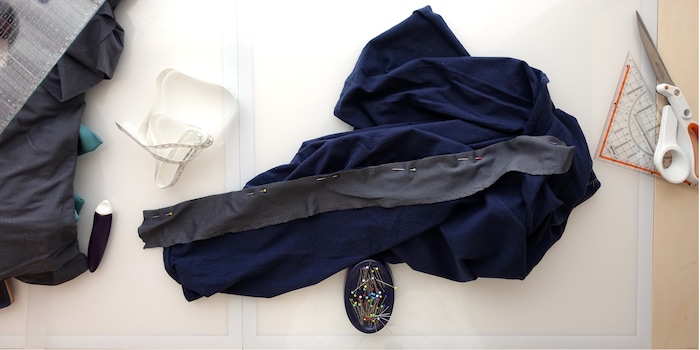 Fasten the insert to the T-shirt using needles. Make sure the right side of the insert even with the right side of the fabric. To sew, Anne uses a serger and a 4-thread overlock. The latter is ideal for elastic materials such as jersey. [[image:18344576 "Pins hold everything in place while sewing",18344577 "The insert is sewn with an overlock or zigzag stitch."]]