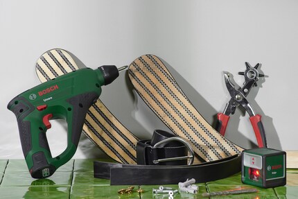 Then cut the leftover leather with a cutter to the desired length. Punch a hole in each end of the leather strips using a cordless hole punch.