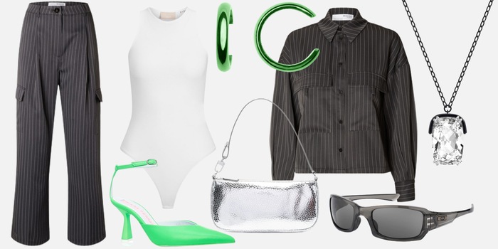 Now, you can go to town on the accessories. Gaudy pumps bring in a bit of extravagance. Meanwhile, green ear cuffs pick up the tone without making the look too busy. A silver bag and jewellery combined with the alien green create a heady colour combo. Finish off with some sporty sunglasses to emphasise the athleisure look of the cargo pockets, and you’re ready to go!