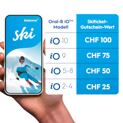 Buy an electric toothbrush from Oral-B's iO series during the promotional period from 15 November 2025 to 15 February 2026 and receive a ski ticket voucher from Ticketcorner Ski worth up to CHF 100. This can be redeemed in 60 ski resorts in Switzerland.