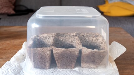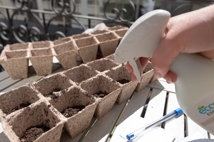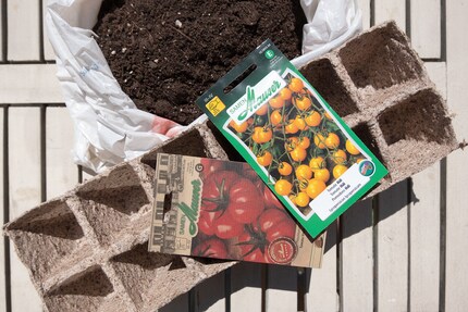 Show allThat’s why I got myself two old varieties: the red Voyage Tomato with its deep ridges, and the yellow plum-shaped Ildi which was common in the former East Germany. To kick off the project, I also need planting tubs, soil and a water sprayer. The special tubs are made of biodegradable material and can be replaced at a later stage. It’s important to use a potting soil suitable for germinating seeds because it contains less fertiliser than regular soil. This is key in the delicate early phase because otherwise, the seedlings could be burnt.