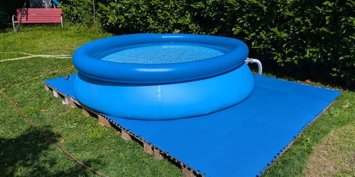 Euro-pallets have a rough, untreated surface, so I covered them with pool mats to avoid getting splinters. The ones I used are 50 centimetres wide and one centimetre thick. Thinner ones are available, but 2,000 kilogrammes of water create quite some pressure, so I wanted to be on the safe side. The jigsaw-shaped mats are very easy to put together and arrange.