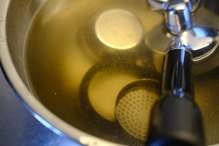 Now comes the boring part: backflushing the group head. To do this, you need the blind filter – in the case of my coffee machine, the blind filter is permanently attached to a portafilter. Depending on your model, you may have to place the blind filter inside the filter basket you just cleaned, or replace the filter basket with a blind filter basket. Put a pinch of cleaning powder into the blind filter and insert the portafilter into the group head (like you normally would to brew coffee). Turn the machine on for about 10 seconds, then turn it off, wait another 10 seconds and repeat this process at least five times. Careful: the dirty water will come shooting out through the valve at the bottom of the group head with a fair amount of pressure. Once you’ve finished backflushing with the cleaning powder, remove the blind filter, rinse and reattach it. Then, repeat the backflushing process using only clean water.