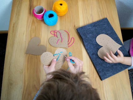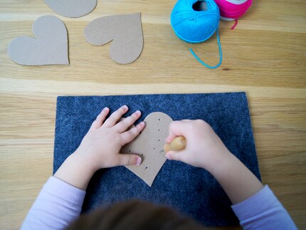 Depending on the age of your child, cut out the cardboard hearts or let your child do it. They can make holes in the heart with a needle (or a prickle needle). Use a thick base made of felt or scrap wood so that no holes are left in the table.