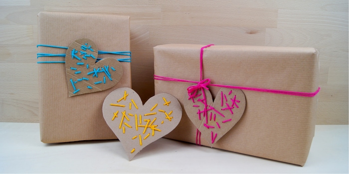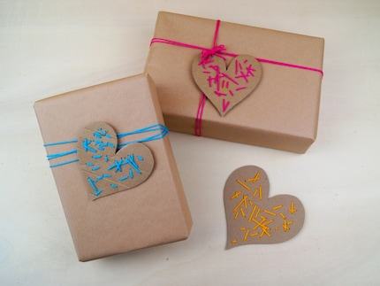 Since a gift comes from the heart, an embroidered heart fits perfectly on the packaging. You can easily make this yourself together with your child.