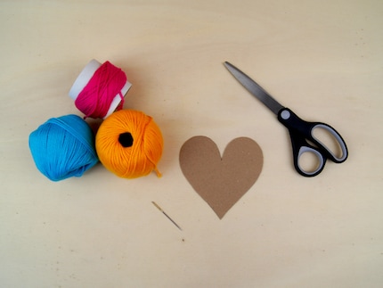 The heart looks best on simple wrapping paper. Use the same yarn again for the ribbon. Either tie the heart in place with a piece of yarn or glue it on.